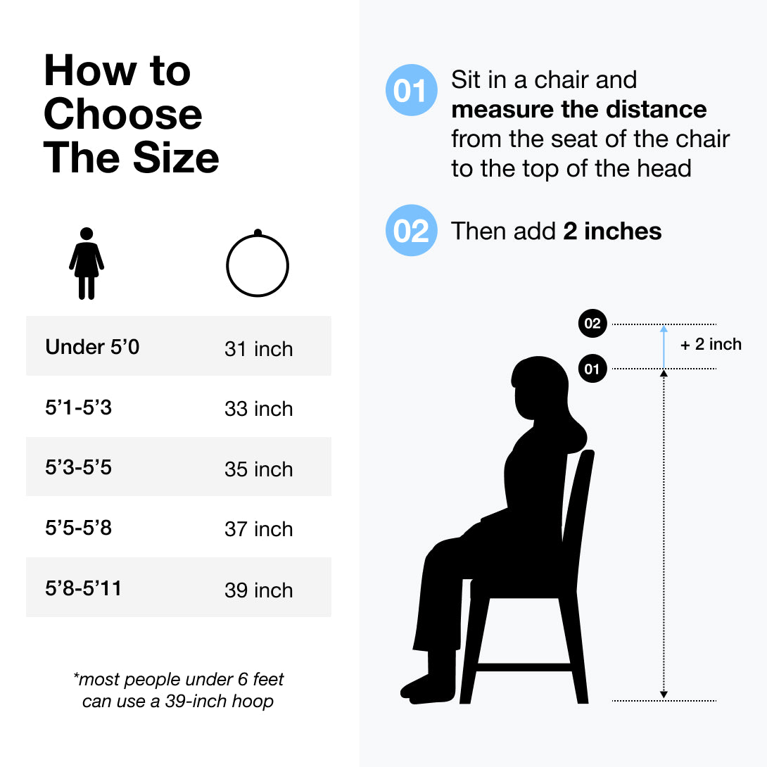 Measuring is important as people carry their height differently. But, as a general guideline, people under 5'0 will choose a 31 inch hoop, 5'1-5'3 may choose a 33 inch hoop, 5'3-5'5 may choose a 35 inch hoop, 5'5-5'7 may choose a 37 inch hoop, and 5'7-5'10 may choose a 39 inch hoop