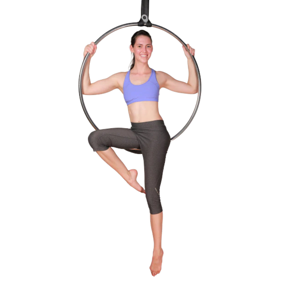 The Aerial Hoop, also known as “Lyra”, is a metal apparatus (made of hollow steel) that looks like a suspended hula-hoop. Aerial hoops are usually available in single-point and double-point configurations.