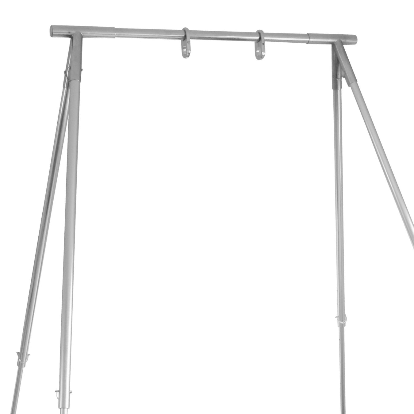 This rig is an A-Frame style, made of stainless steel and magnesium alloy. It’s strong and sturdy yet light enough to travel, making it the most portable aerial rig available. It is completely height-adjustable, extending from 5ft (152cm) up to 11ft (335cm) in 3-5 inch increments, allowing you to fit it in short ceilings indoors and expand to maximum height outdoors.
