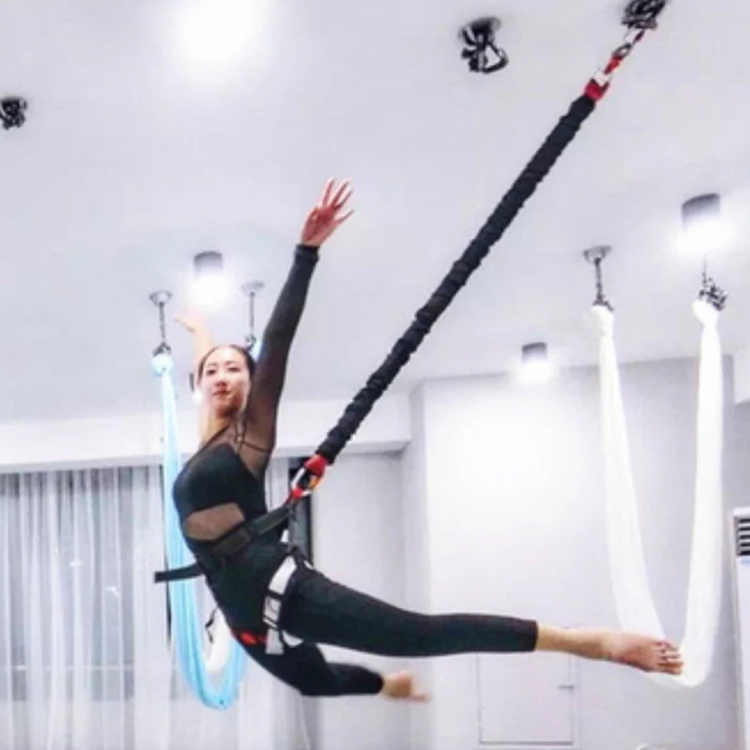 The included Extension Straps (daisy chains and slings) can be used to mount to an exposed structural beam or weight-bearing piping; professional installation is recommended. The Ceiling Mount Hook can be used for ceilings 12 feet and under; this equipment is recommended to be professionally installed. Bungee fitness can be practiced on our Height Adjustable Aerial Rig, but running jumps are not recommended, and students should stay within the footprint of the rig.