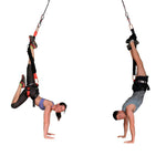 This set-up comes with a padded harness, bungee cord, daisy chain to adjust the height, swivel so that you can hop and spin, and slings to rig to an overhead beam or hook.