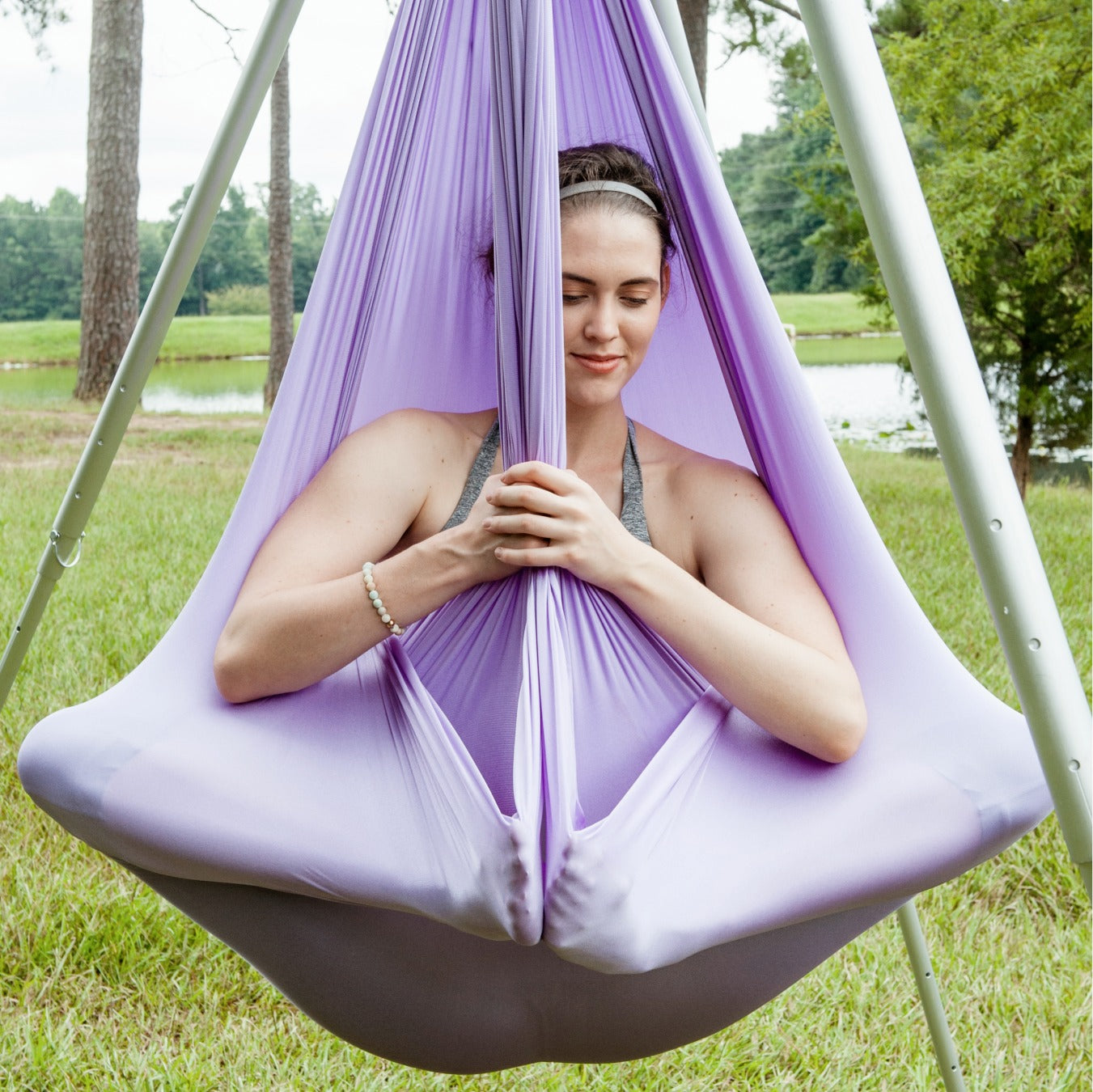 We take pride in our high-quality products and will support you in getting started. We're a small business led by real people here to help you! The aerial hammock set comes with everything you need to start practicing Aerial Yoga today. The aerial yoga hammock can be suspended from either one or two points and will help support and deepen your yoga poses. It's comfortable, durable, and can be used both indoors and outdoors. Plus, it's a ton of fun!